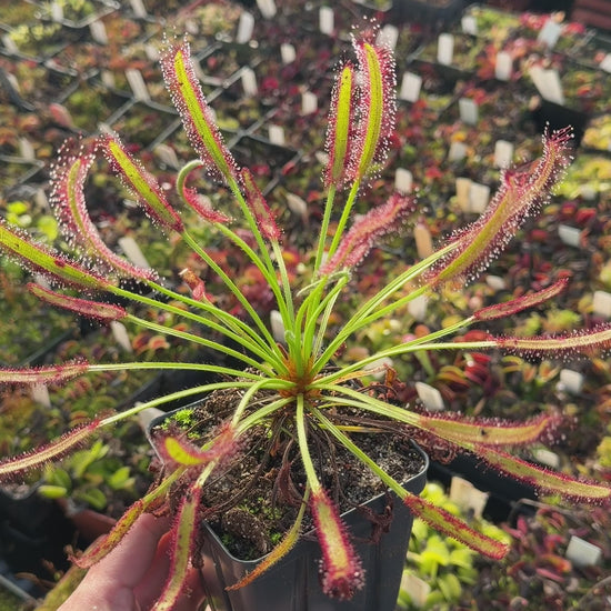 Browse our curated selection of Drosera capensis for sale, ideal for both beginner and expert carnivorous plant growers. Known for their dazzling, dew-covered leaves and efficient insect-trapping abilities, Drosera make a striking addition to any plant collection. Each plant is cultivated with care and shipped bare-root to ensure safe, clean transport and healthy establishment in your setup. Whether you're expanding your carnivorous plant collection or discovering sundews for the first time, you'll find a variety of stunning species and hybrids in our shop. Bring home a living work of art and enjoy nature's elegant pest control.